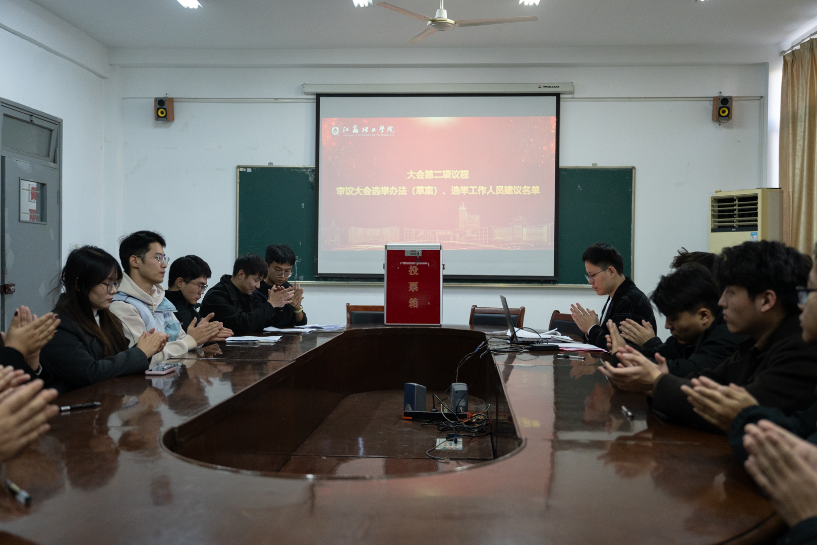 会议宣读了江苏理工学院机械工程学院第一届研代会常任代表候选人及主席团候选人名单,审议通过大会选举办法、选举工作人员建议名单。经无记名投票选举,王培上、陈子言、胡永杰、俞文丽(女)、缪华滨5位同学当选为我院第一届研代会常任代表;李昕(女)、康栖、缪华滨3位同学当选为我院第一届研究生会主席团成员。