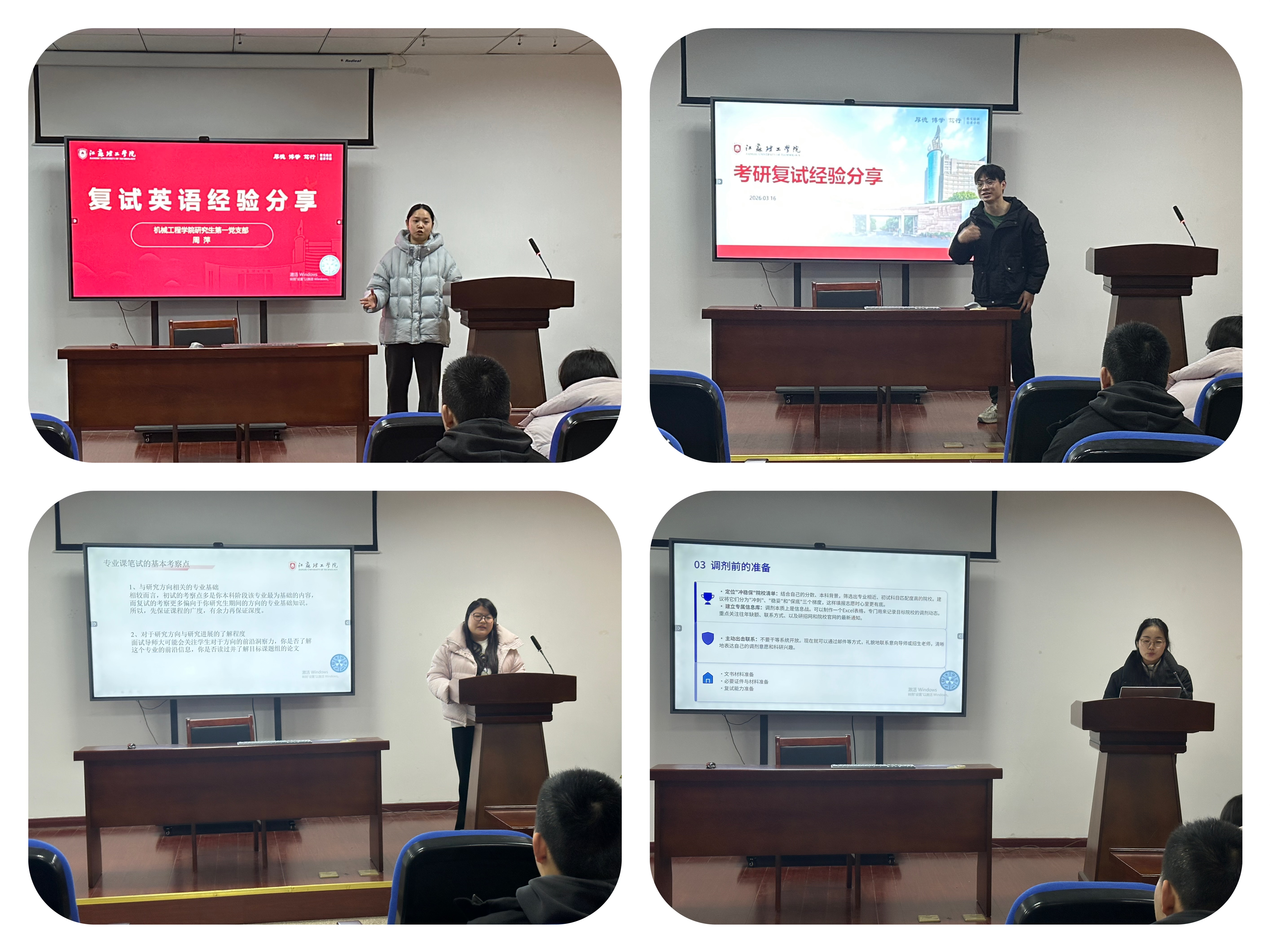 研究生各党支部推荐的五位研究生就考研复试分享经验。他们分别从“专业知识深度与广度的平衡”“科研项目与竞赛经历的陈述逻辑”“英语口语与听力备考技巧”“面试礼仪与临场心态调整”以及“调剂过程中院校与专业的选择权衡”等不同维度提供了“实战攻略”。
